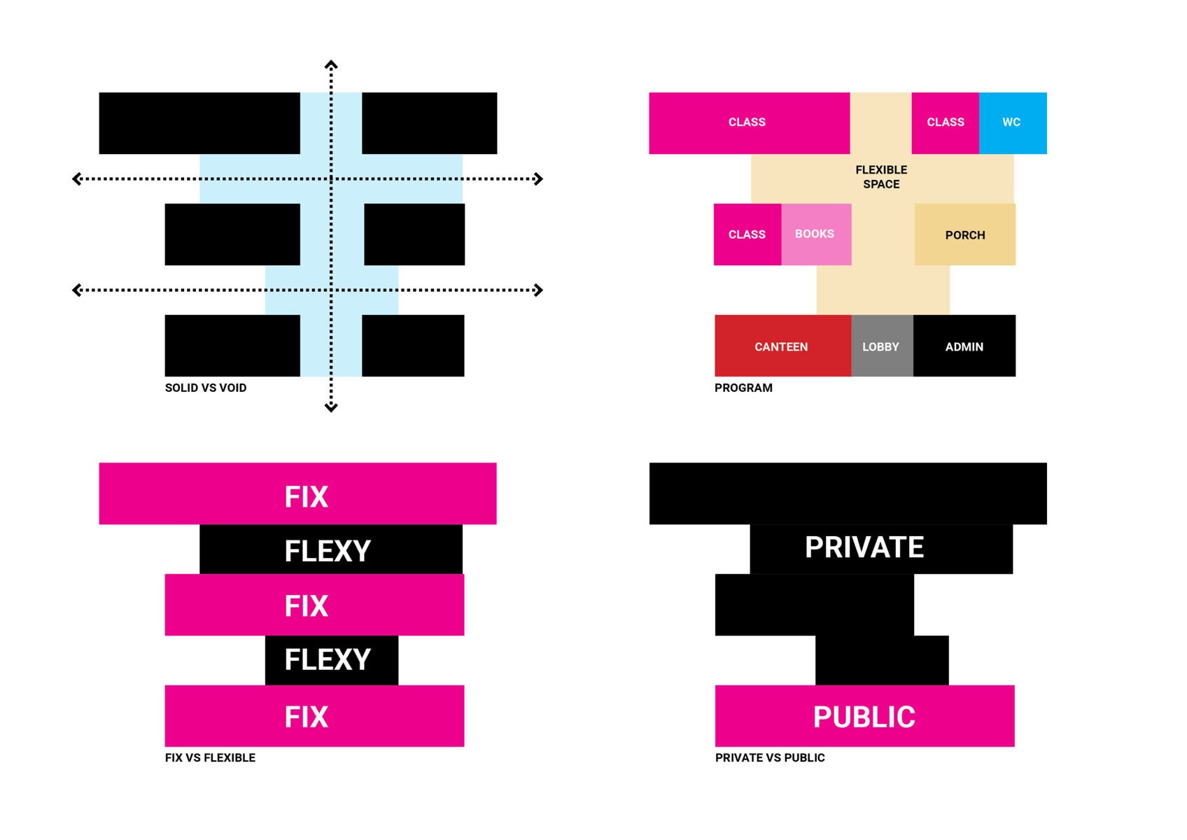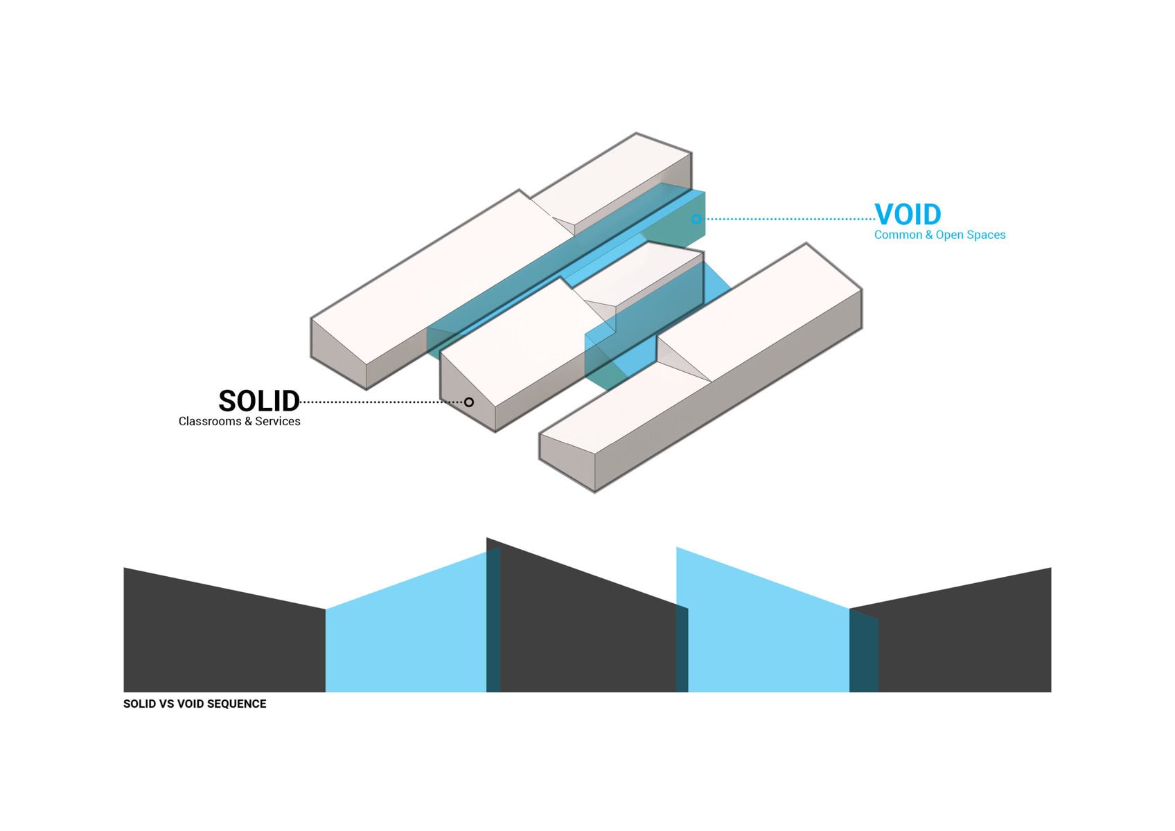 The design beautifully embraces the relationship between solid and void, with the solid representing traditional classroom layouts and the void symbolizing innovative spaces. This dynamic fosters creativity, nurtures community, and connects students to nature, empowering them to flourish academically and personally in a vibrant learning environment.