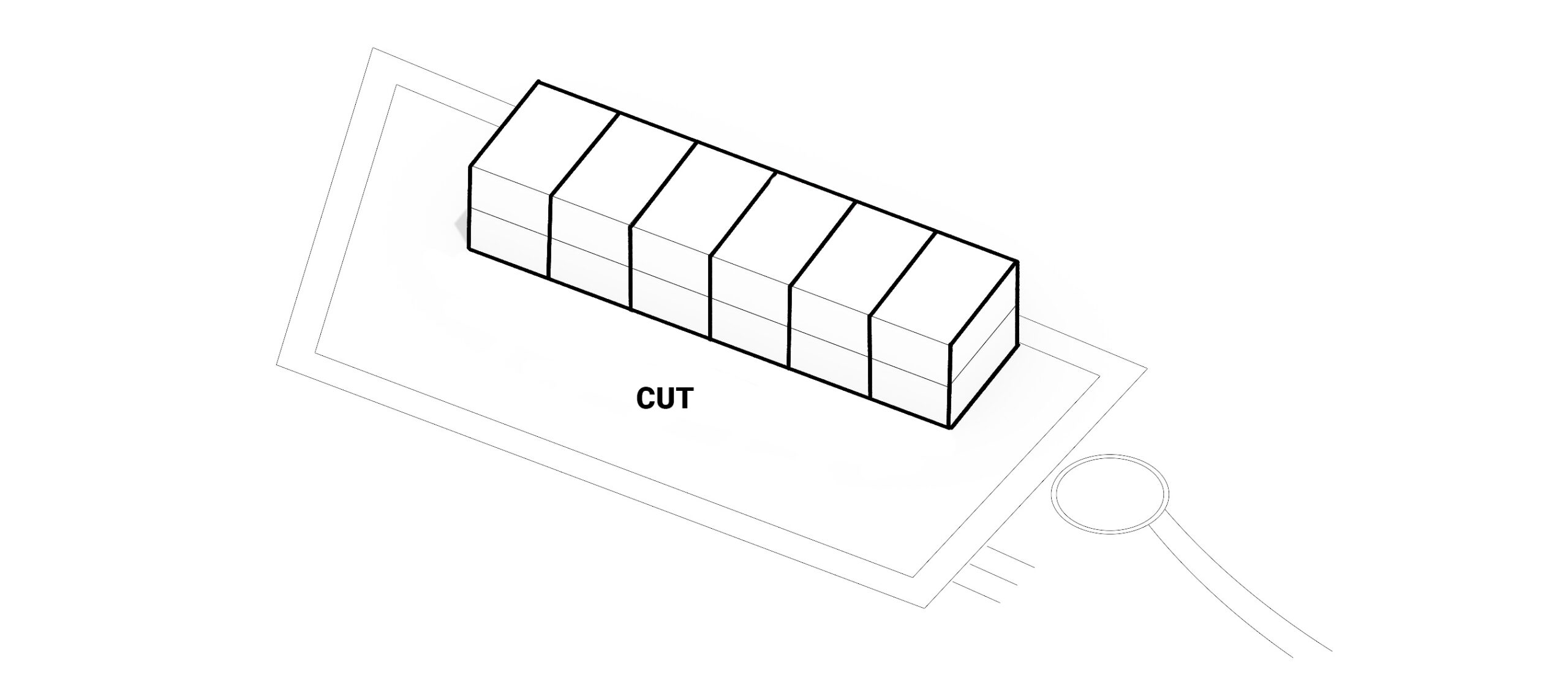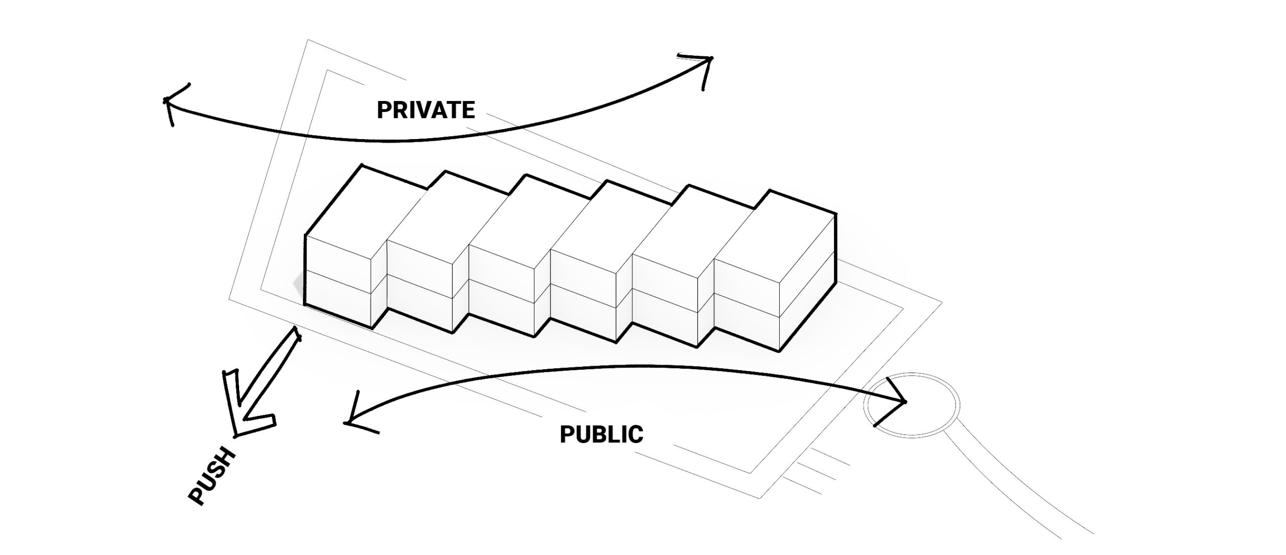 The rectangular site unfolds into two distinct yet harmonious zones: