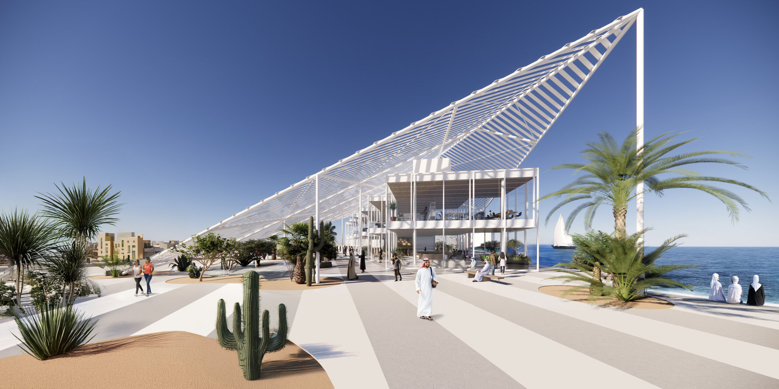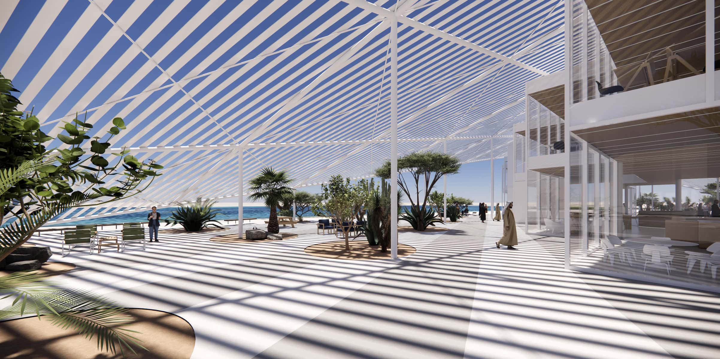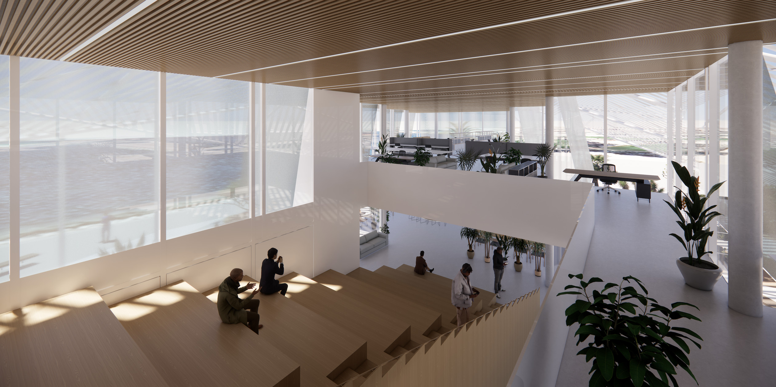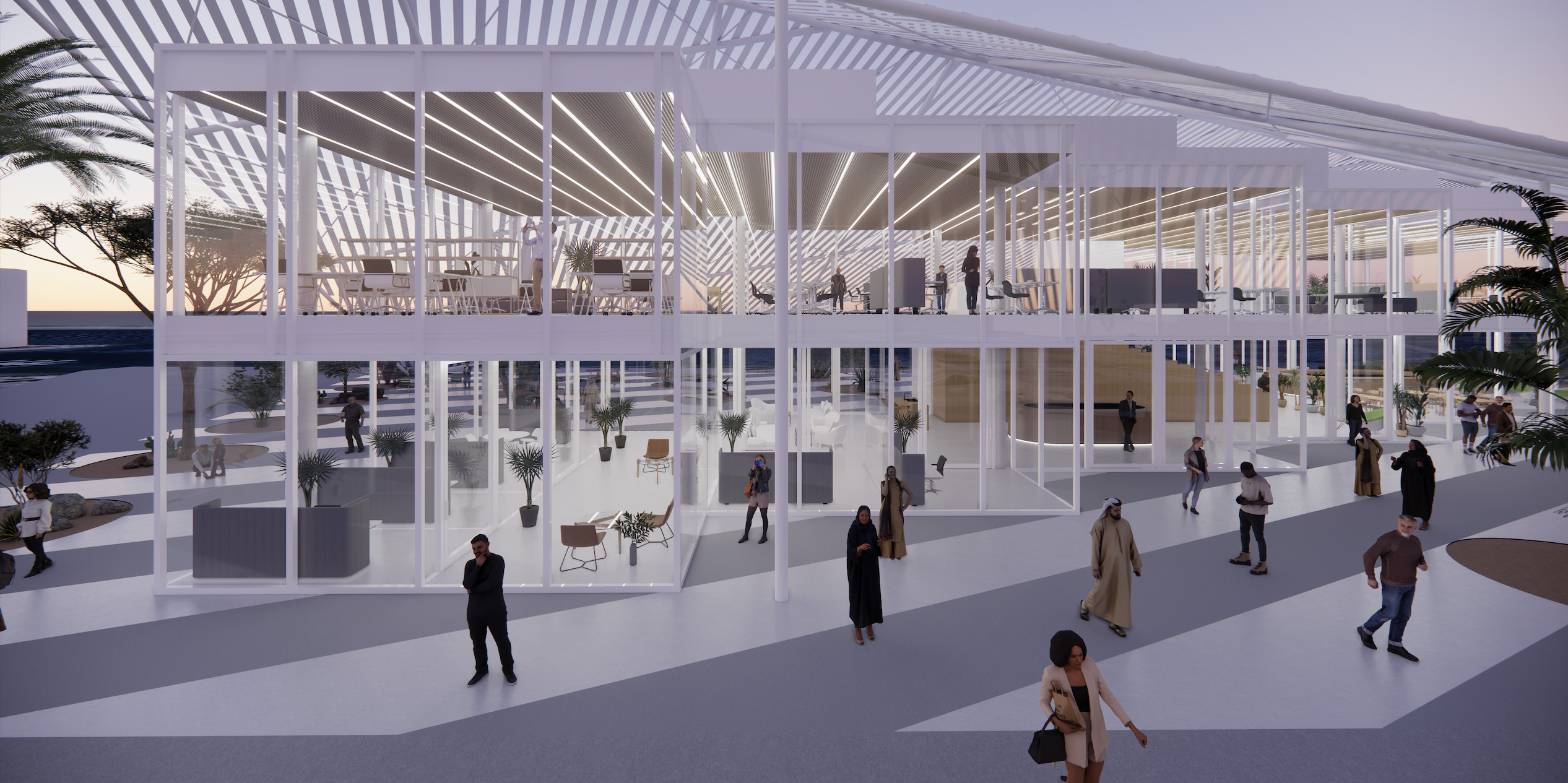 Set along the breathtaking waterfront of Jubail City, this site is part of an ambitious new masterplan to transform the area into a dynamic hub for creativity and collaboration. Conceived as a living habitat, the co-working space blends sleek transparency with lush greenery, framing stunning water views while maintaining a deep respect for the natural environment.